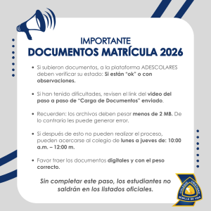 Apreciados padres de familia, queremos recordarles que subieron documentos en la plataforma ADESCOLARES para el proceso de matrícula
